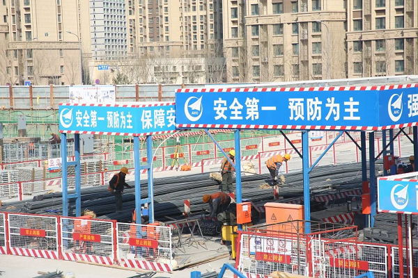 走进工地,一个巨大的基坑映入眼帘,随处都是忙碌施工的工人和大型器械。伴着微微轰鸣声,3台塔吊正在接续不断地向基坑内吊运建筑材料,工人们正在进行地下一层、地下二层的钢筋绑扎作业,工程进展紧张有序、忙而不乱。